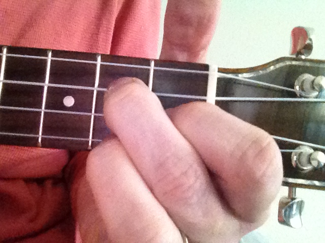 For the C chord, you’re going to put your finger on the bottom string at the third fret (luckily the third fret has a convenient white dot in the middle, which makes it easy to find). In order to make chord changes easier, it’s better to use your ring or middle finger, which is going to feel strange at first, but you get used to it. Then you use your right hand to strum all four strings just over the sound hole. There are lots of ways to strum. You can curl your fingers loosely, and strum with the nail side of your index, middle, ring and pinkie fingers all together (keeping your hand loose). Or you can strum with the nail side of your index finger only. Or you can strum with the fleshy side of your thumb. Find something that feels natural, and just practice strumming down across the strings, keeping an even rhythm.