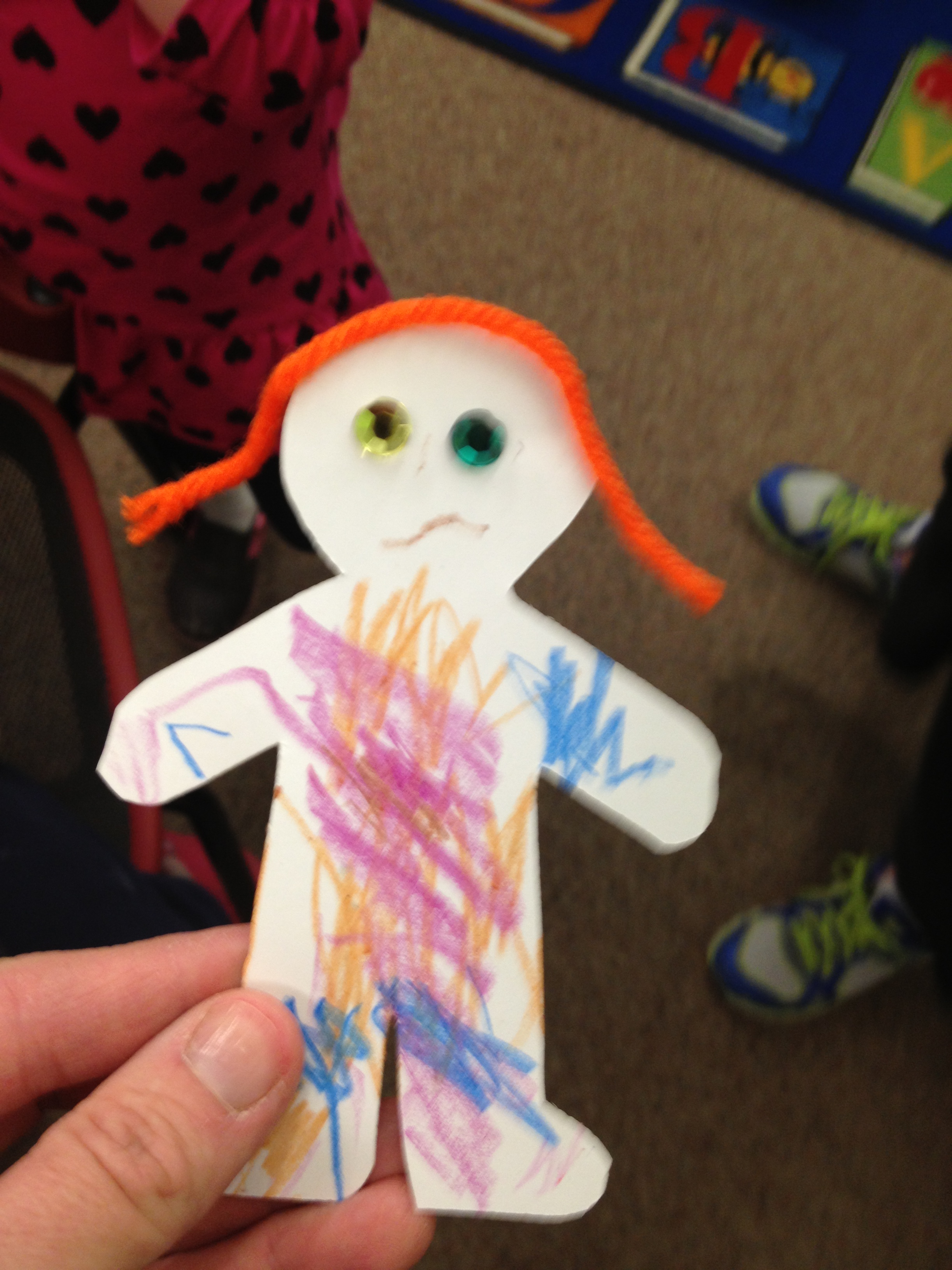 I cut out blank paper dolls from the template provided on the Family Crafts About.com page. The kids colored the dolls with crayons and glued on different colored pieces of yarn for the hair to make them look like members of their family. Most of them only got one doll done (a lot of them made themselves or their moms), but they were all adorable.