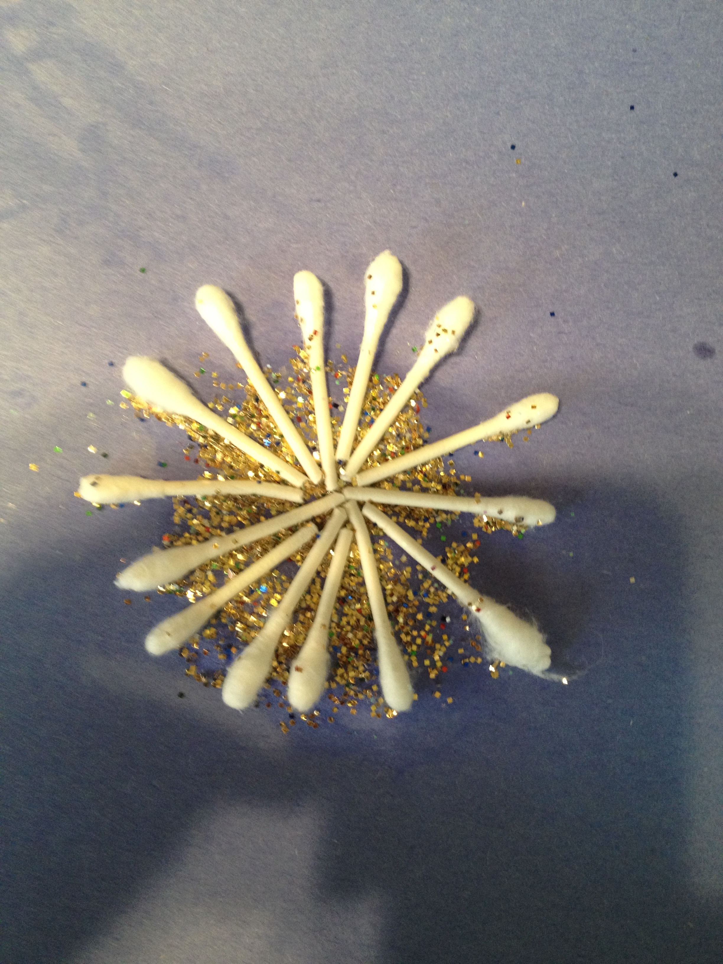 I got this idea from one of my favorite kids craft websites: Busy Bee Crafts. I had broken up a number of Q-Tips ahead of time (I found out the hard way that if you try to cut Q-Tips with scissors, they not only hurt your hands, but also shoot across the room like little cotton-tipped missiles. But they break very easily. Go figure!)