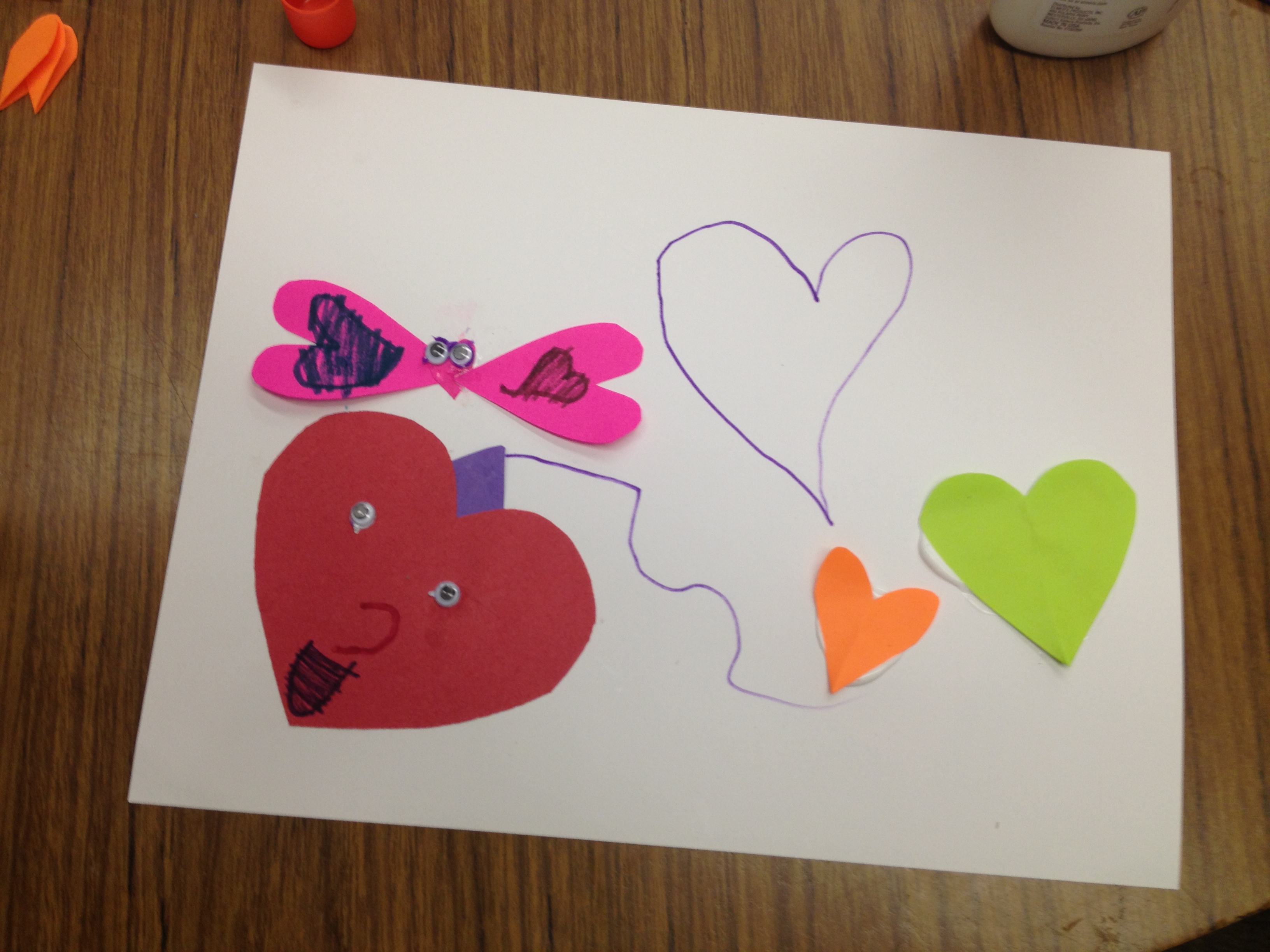 This was an easy craft I found on the Allen County Public Library Youth Services web site, on a page with a list of other good books and songs about emotions. I adapted it a little, and created a Word document with circles for the kids to draw faces in. You can print the template here. I also cut out arrows out of cardstock, and punched holes in them for the metal brads (I attached the arrows to the page ahead of time because that part seemed a little tricky, and the brads are a bit sharp. I just pushed them through the middle of the paper and twisted them a bit until the arrow could spin easily, then separated the metal tabs on the back of the page to hold them in place).