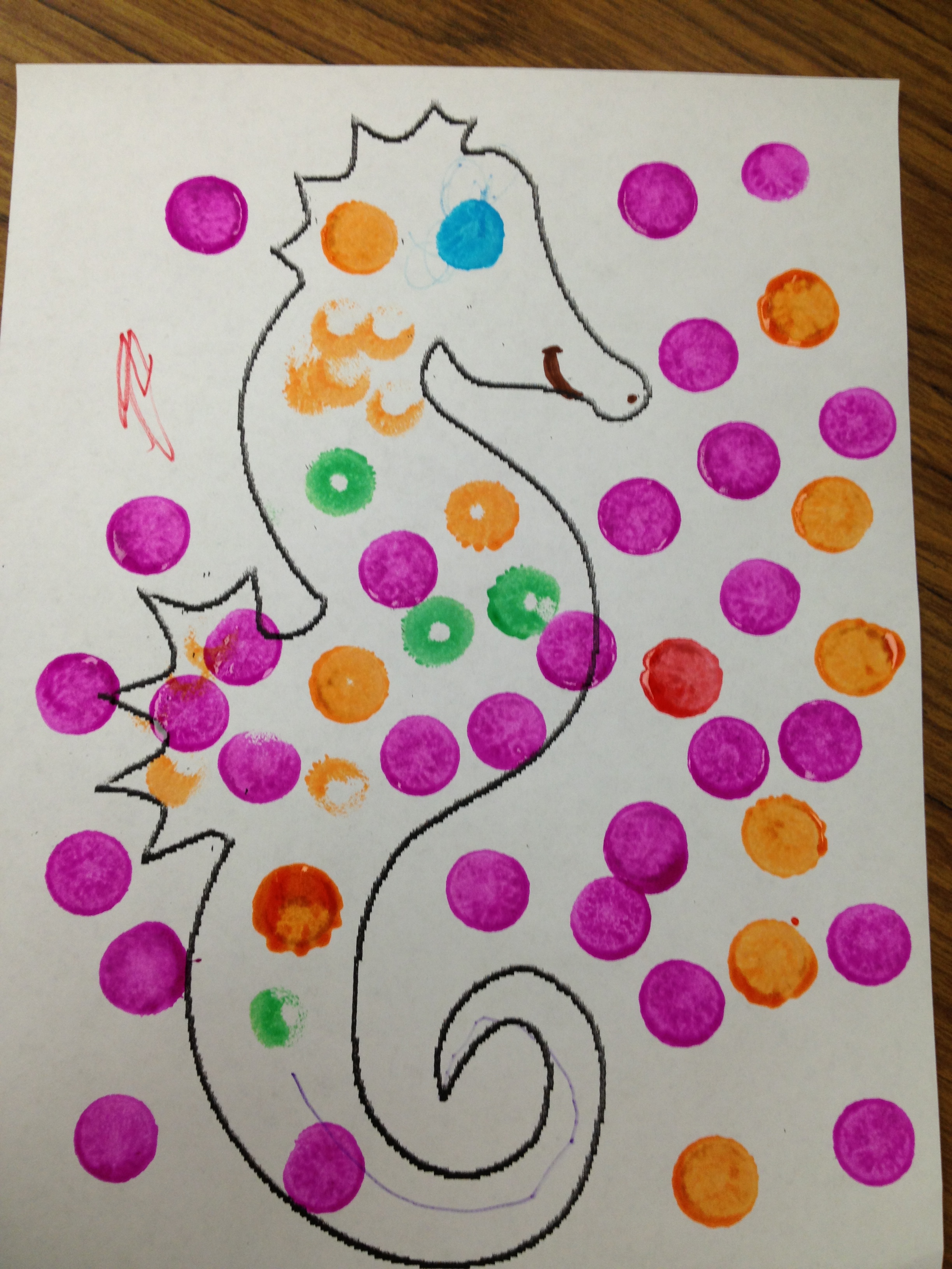 This was probably the easiest craft I’ve ever done, since I just gave the kids Do a Dot Art Markers, paint, crayons, pencils, markers, and white paper and told them to make whatever they wanted. Most of them made their own dot creations, but one girl decided to draw instead. They were all completely absorbed, and it was so much fun to see the variety of pictures they created.