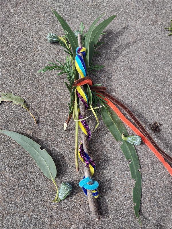 I’ve been trying to find simple activities for the stay-and-play that allow kids to explore things around the park, so I was really excited to find this Magic Nature Wand activity from Mini Mad Things. I put out pipe cleaners, multicolored yarn, and scissors for the kids, and encouraged them to look around for sticks (not too big or too pointy) to make into wands, and leaves to attach to them. They turned out beautifully! Here is one example:
