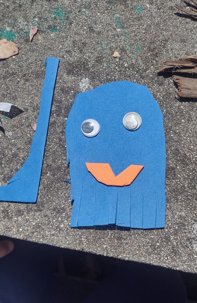 To be honest, I had no idea if this project was going to work, but it ended up being a lot of fun. Basically, I put out foam sheets for the kids or grown-ups to cut into shapes. When these get wet, they will temporarily stick to the walls of a bathtub. To decorate them, I put out some small pieces of adhesive foam sheets that they could cut into mouths, noses, or other shapes. I brought several different kinds of scissors: regular kids scissors, as well as adaptive scissors for both kids and adults. I also put out googly eyes and some markers, which were really intended for drawing out the shapes before cutting, since they would wash off in the bathtub, but some kids used them to draw on their shapes too.