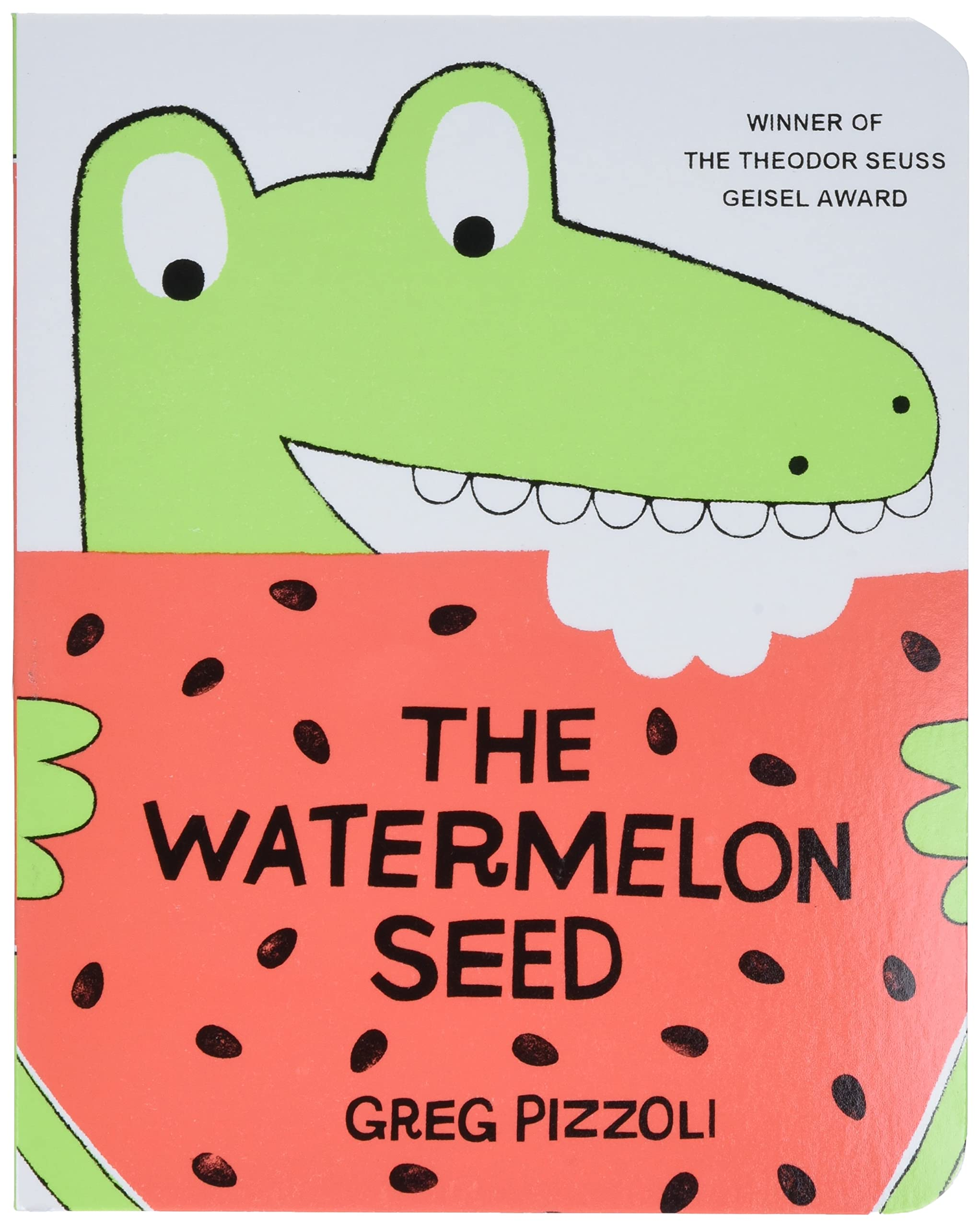 Adorable story about a crocodile who loves watermelon, until he accidentally eats a seed. He is convinced that a watermelon will grow in his stomach, and relieved when he burps the seed up. He vows never to eat watermelon again…but who can resist watermelon? I asked the kids throughout if they thought the watermelon would really grow in his stomach, so they could call out, “NO!”
