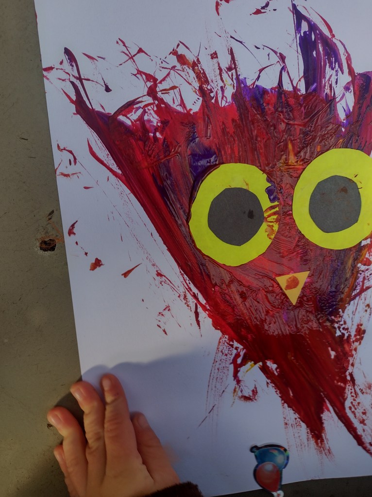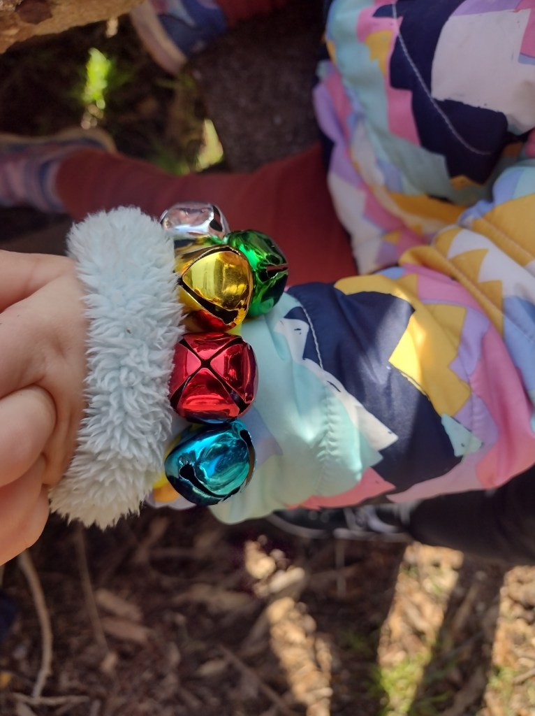 I put out pipe cleaners, jingle bells, and also some red string with scissors, so they had a choice of what to string their bells on. I was worried that this might not give them much of an opportunity to be creative, but they all made different things: necklaces, bracelets, and even crowns. They were all different, and they were soon making jingle bell jewelry for other family members, and taking materials home to make more.