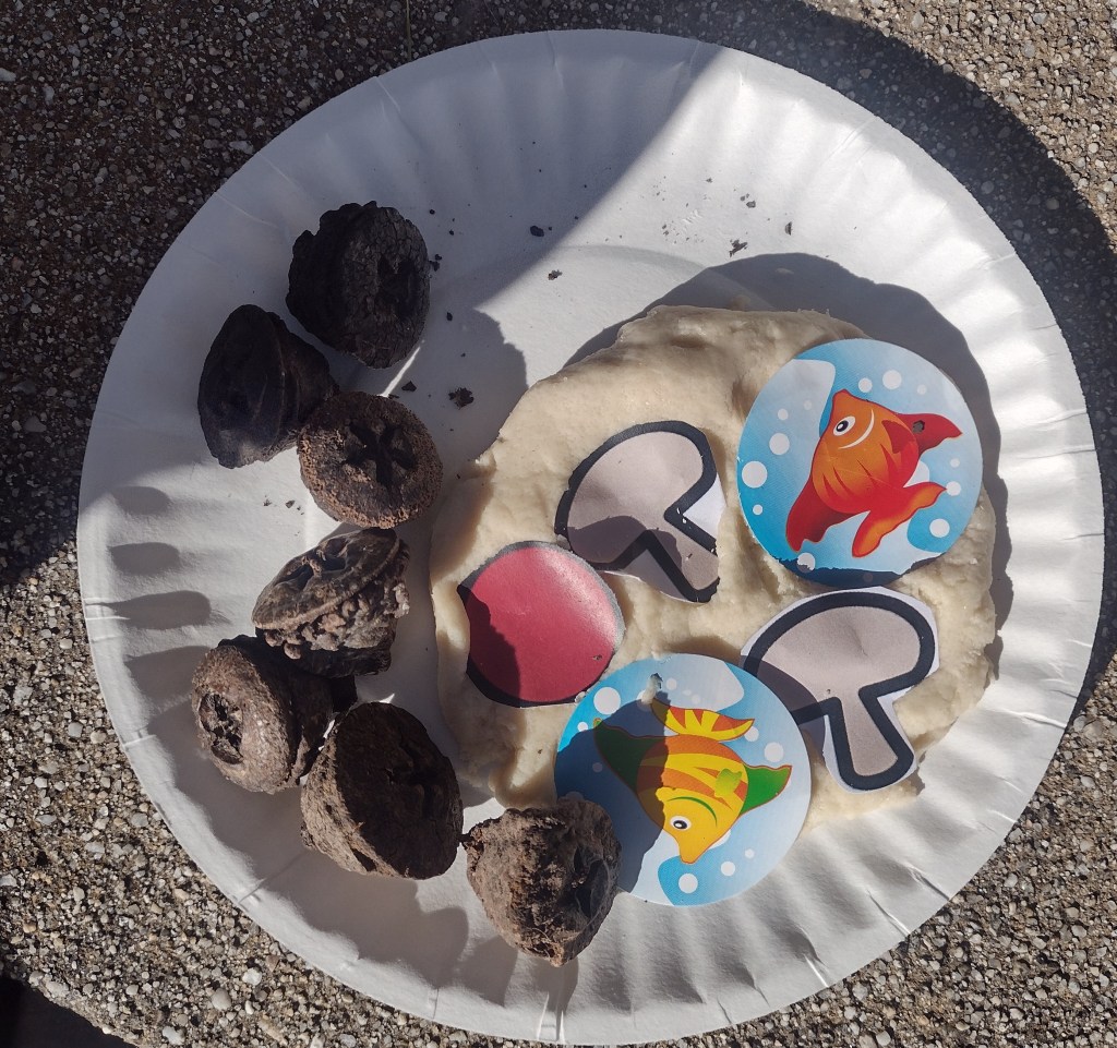 For the storytime, I put out golf-ball sized balls of dough on small paper plates, along with playdough toys like plastic rollers and pizza cutters. I had also cut out some clip-art pizza toppings from My Cute Graphics. The kids had a great time rolling and slicing their dough, and adding toppings. Some of them even added extras, like their storytime stickers, and some of the gum nuts they found on the ground at the park.
