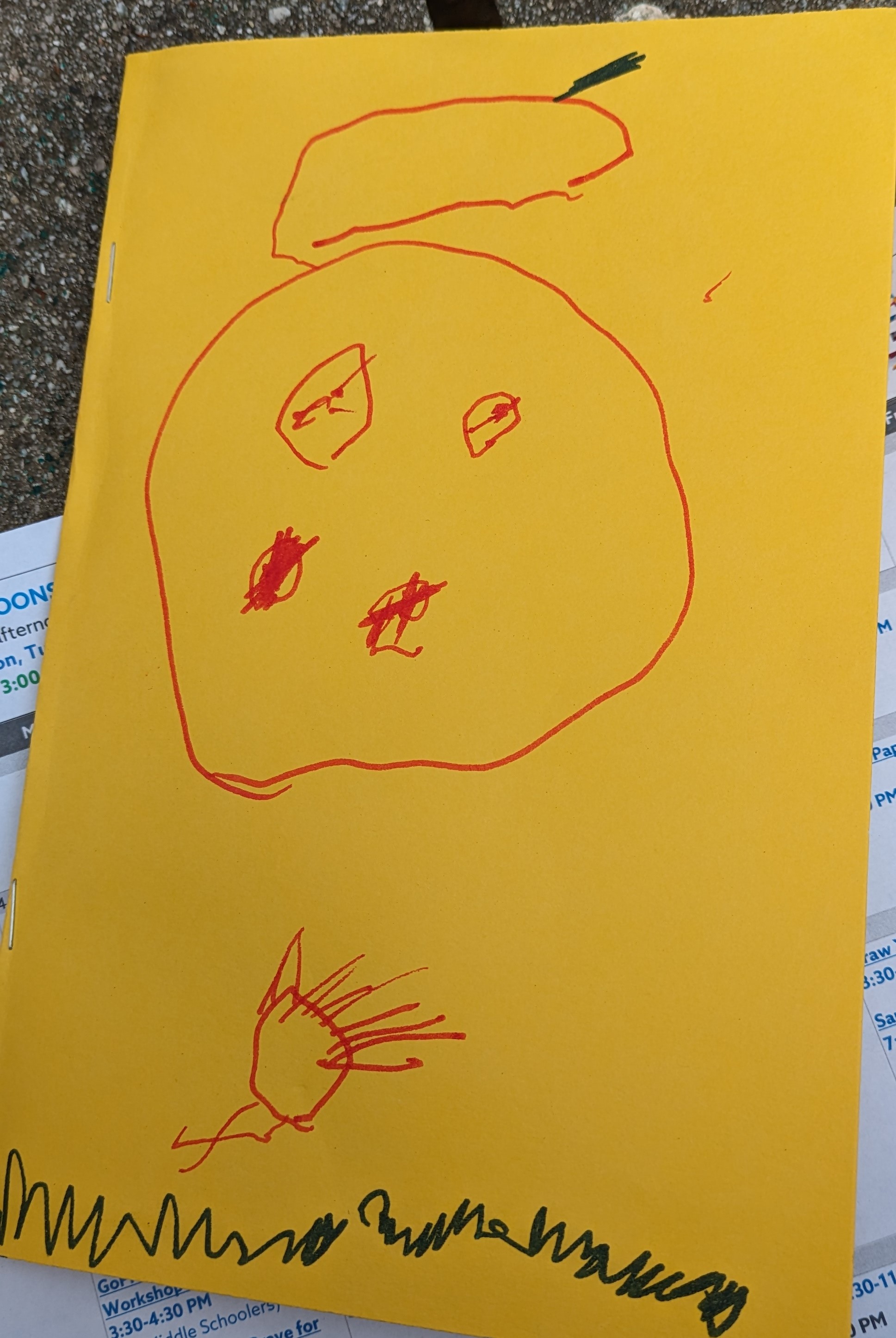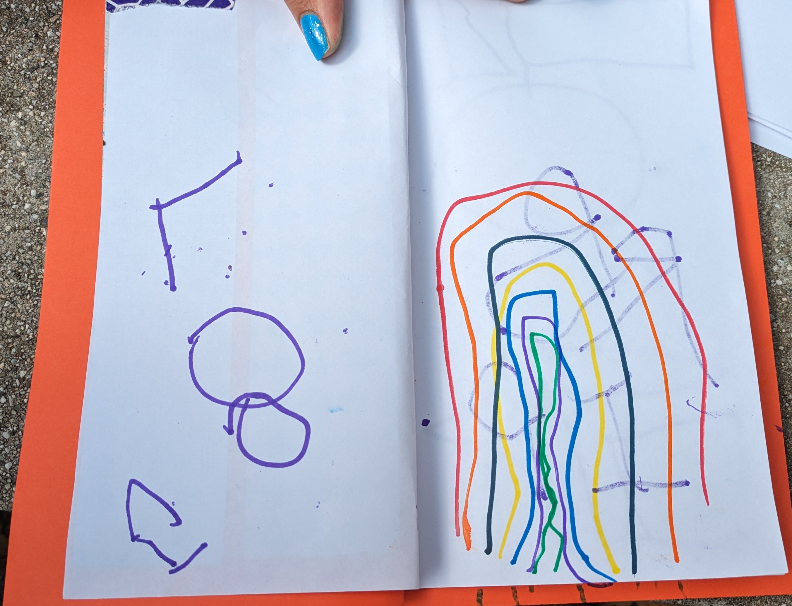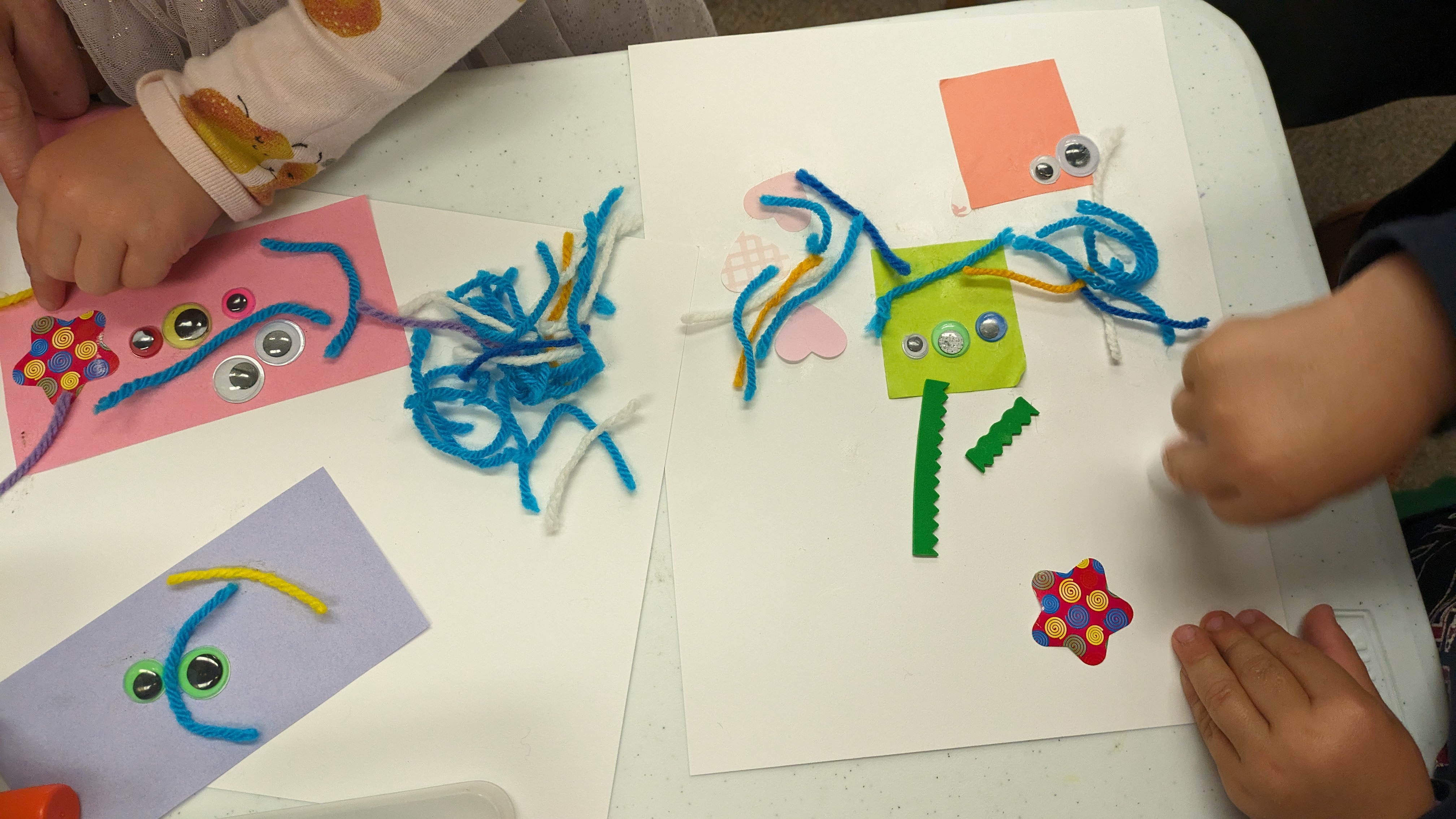 For the Stay and Play, I put out dot markers, white cardstock, markers and googly eyes. As usual, I told the kids they could make caterpillars, or whatever else they wanted with the art supplies. There were some really fun dot marker and line creations.