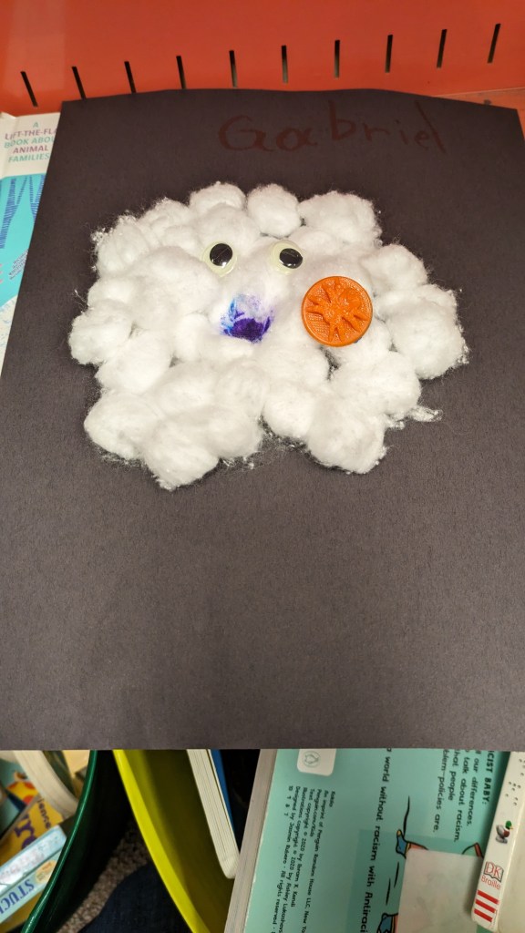 For our Stay & Play, I put out black construction paper, cotton balls, glue sticks, googly eyes, and dot markers for the kids to make cotton ball ghosts. I was amazed by the different designs they came up with. In my example, I had made a ghost shape out of the cotton balls, and then put the googly eyes on top, but many of the kids opted to put their eyes directly on the paper, with cotton balls scattered across the page in different ways. Several of them had ghosts with lots of eyes as well. Spooky fun!