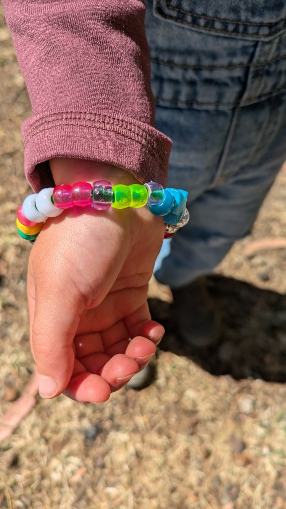 This was a quick and easy Stay & Play activity. Before storytime, I cut circles out of yellow paper and punched a hole in each one. I also cut pieces of red nylon cord roughly 24″ long.