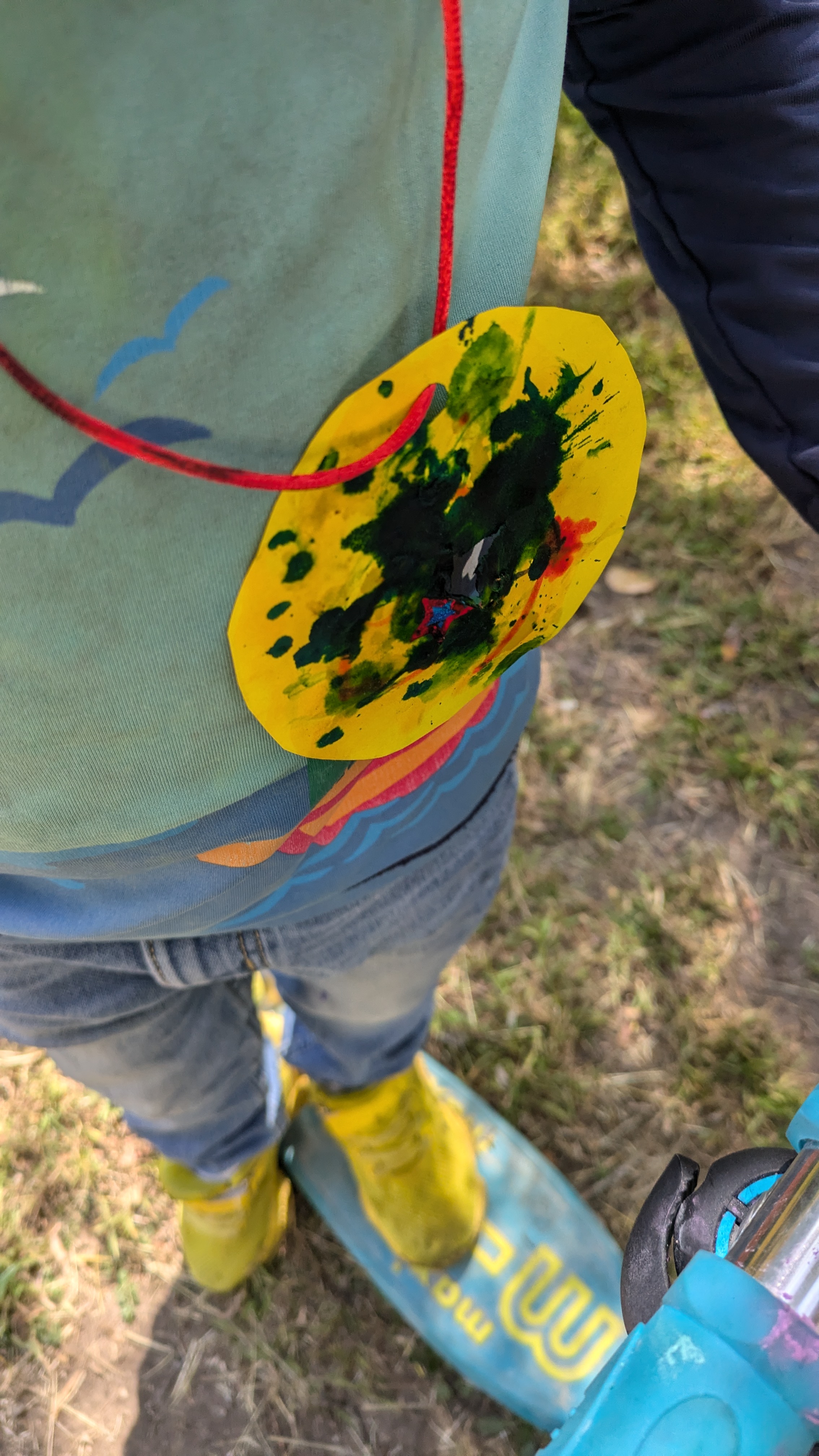 This was a quick and easy Stay & Play activity. Before storytime, I cut circles out of yellow paper and punched a hole in each one. I also cut pieces of red nylon cord roughly 24″ long.