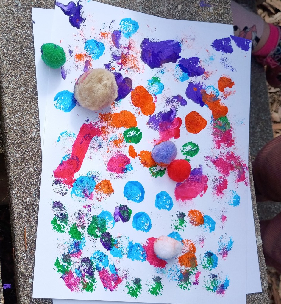 This Stay & Play was based on Rhyming Dust Bunnies. Before the storytime, I cut out small strips of colored paper for the arms and legs. For the Stay & Play, I put out glue sticks, markers, the colored paper strips, googly eyes, and small coffee filters (the kind you use for an Aeropress, although you could also use regular sized ones). The kids really enjoyed assembling and decorating their dust bunnies.
