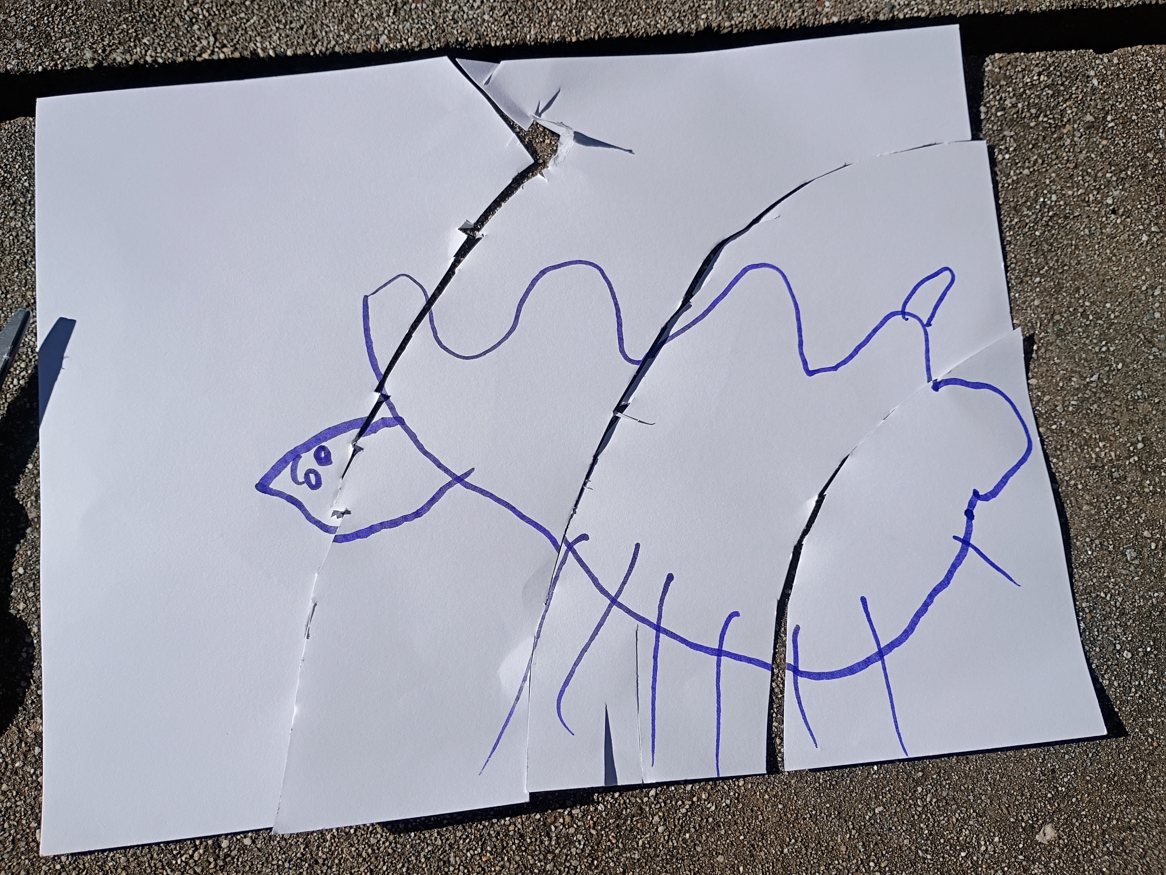 I put out white cardstock, markers, and kids scissors, and told the kids they could write or draw something, and then cut the paper into a few pieces to make a puzzle for a friend or family member to put together. Or they could ask their grownups to make a puzzle for them to solve. Although I didn’t get any pictures of this, my favorite example was a child who drew a unicorn, and their grandmother wrote the word UNICORN above the picture before they cut it into a puzzle. For Family Storytime, I helped some of the smaller kids write their names to cut into a puzzle.