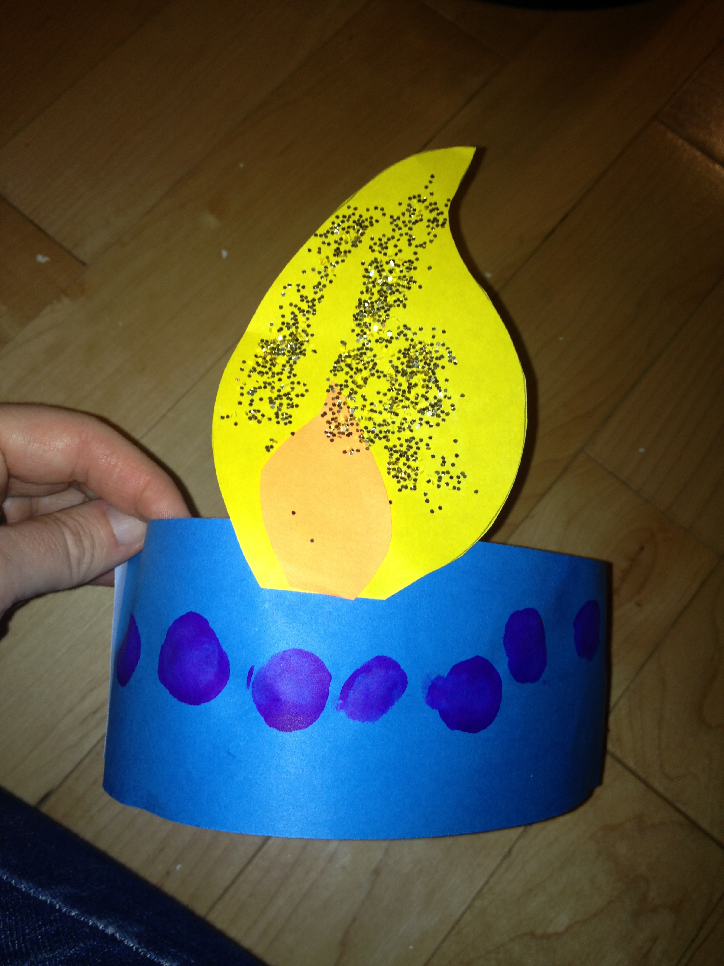 Esther had suggested this craft. I based ours on this one from Pinterest. I cut out strips of blue paper for the headbands, which we helped the kids assemble with staples. I cut the flames out of yellow paper, with a little flame in orange to go in the middle. We also gave the kids dot paint, glitter glue, and glitter to decorate. They had a great time, although of course the library was glittery afterwards.